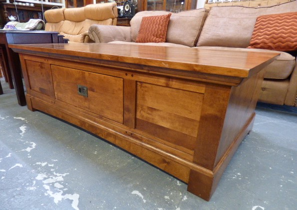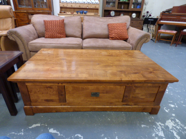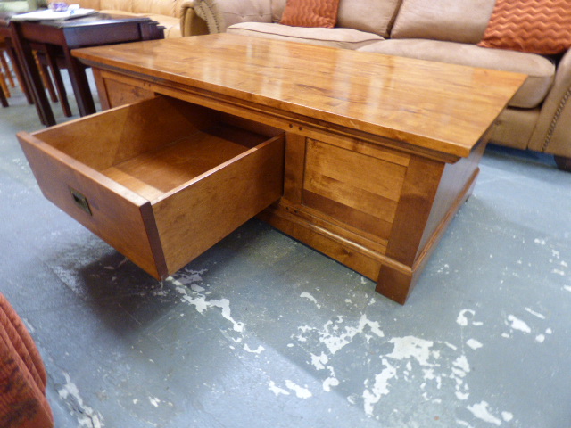 Hardwood beautiful coffee table with large central drawer that opens from both sides – 140cm width / 80cm depth / 45cm height = £150